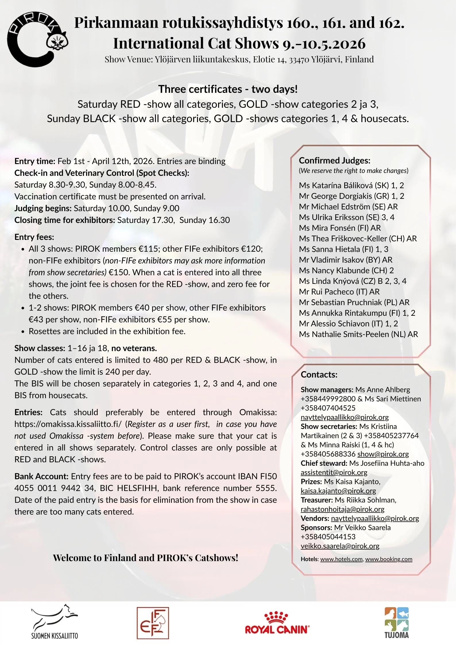 Sunnuntaina BLACK -näyttelyssä kaikki kategoriat, GOLD -näyttelyssä kategoriat 1, 4 & kotikissat.